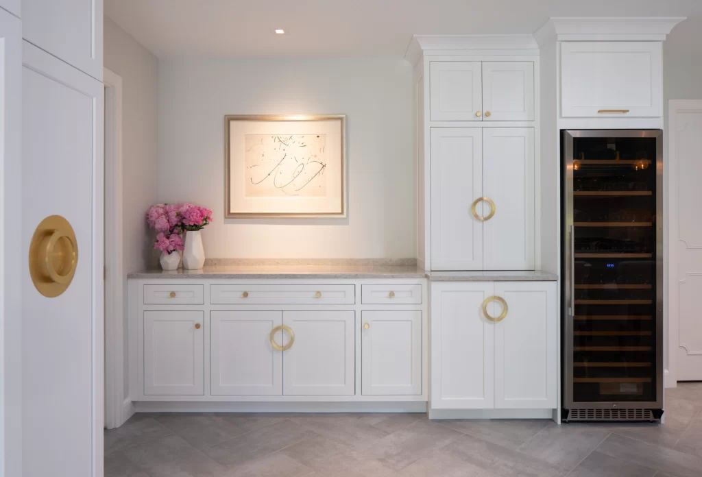 The designated coffee station allows for a stress-free morning routine and the wine bar with custom stemware cabinet provides an elegant evening ritual. The custom cabinetry offers the highest level of organization, pull-out pantry cabinets that house waste and recycling, peg drawers for plates and silverware, additional storage overhead, as well as a dog bowl niche integrated within the island.
